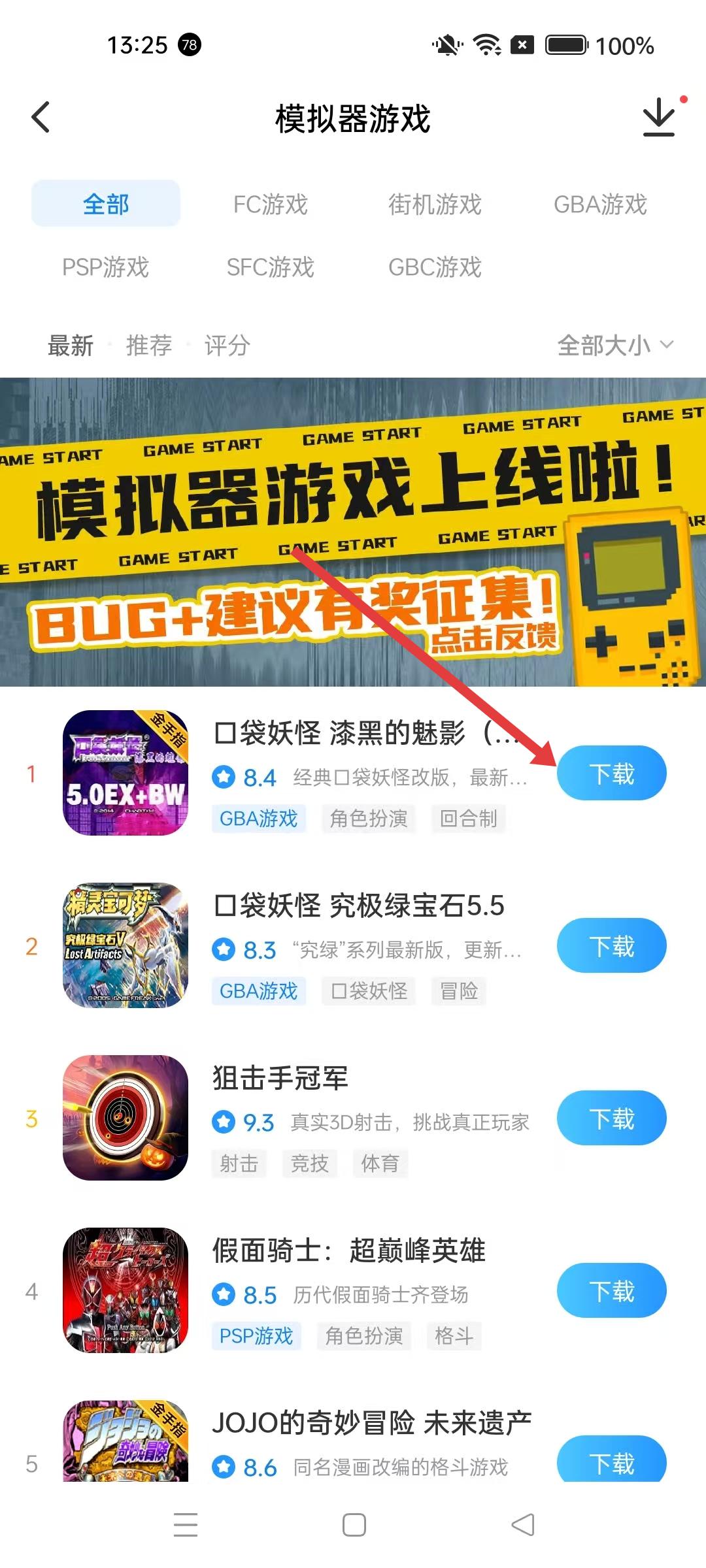 4、模擬器游戲列表頁面,有口袋妖怪漆黑的魅影、狙擊手冠軍等多款游戲,每款游戲旁有下載按鈕,點擊即可下載對應的模擬器游戲。