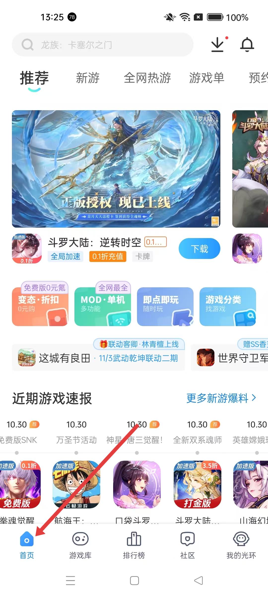 1、進入光環助手首頁,可看到推薦、新游等板塊,還有變態折扣、MOD單機等功能入口,從這里可進入個人中心,開啟模擬器游戲下載操作。