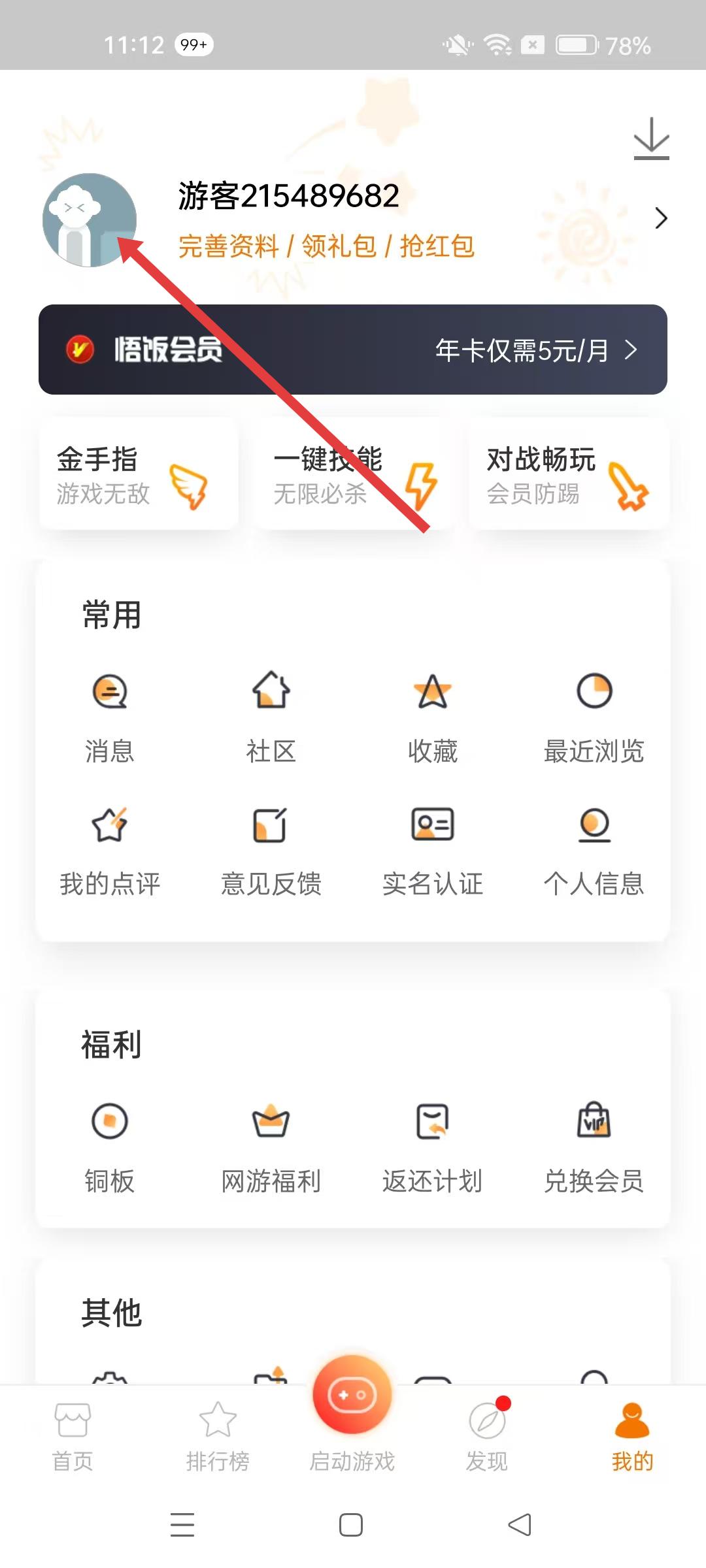 1、悟飯游戲廳首頁,點擊我的,可進入個人界面,查看消息、社區、收藏等功能選項。