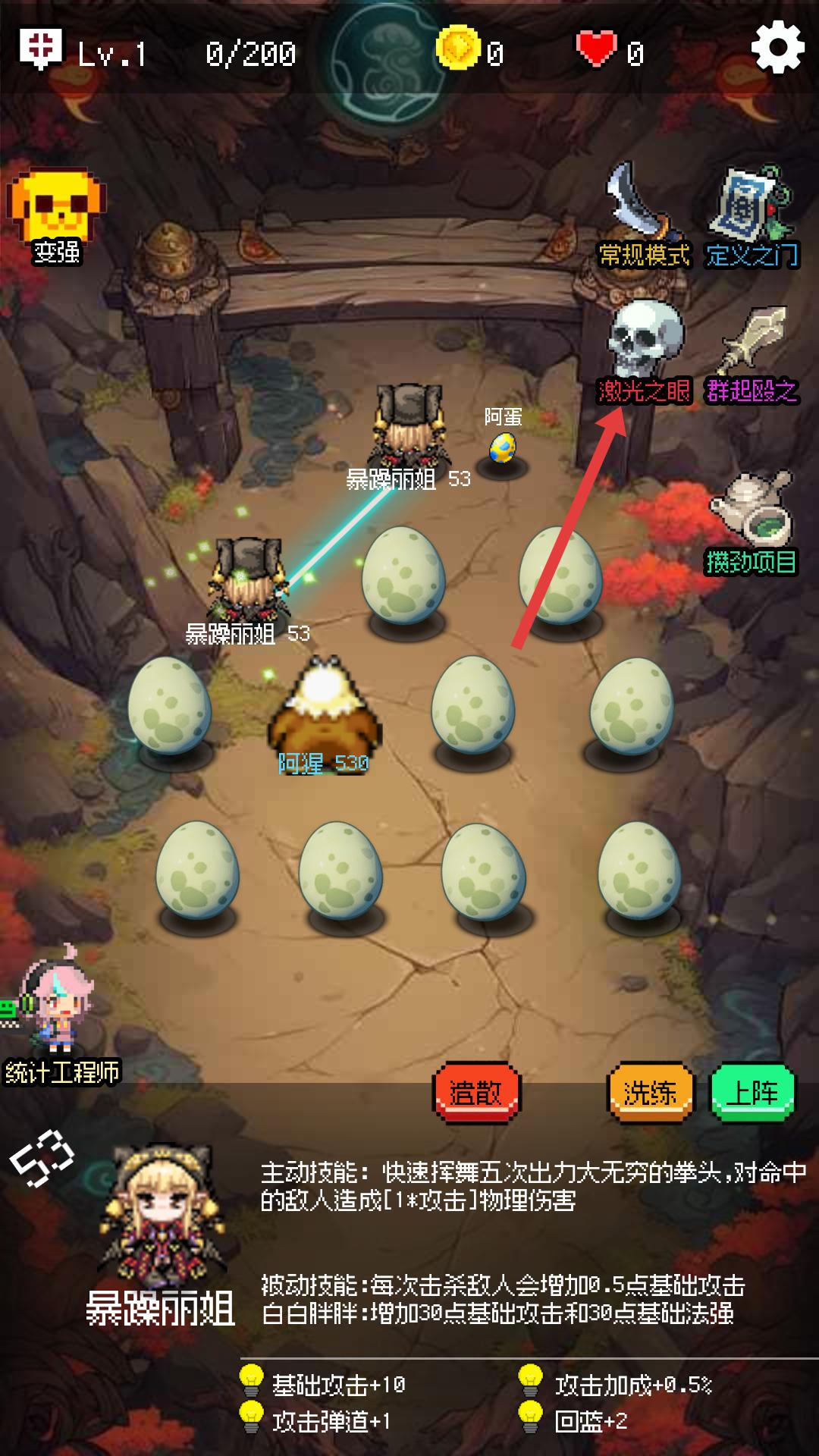 1、可點擊【激光之眼】等模式選項進入戰斗,像【暴躁麗姐】有主動和被動技能,助力戰斗。