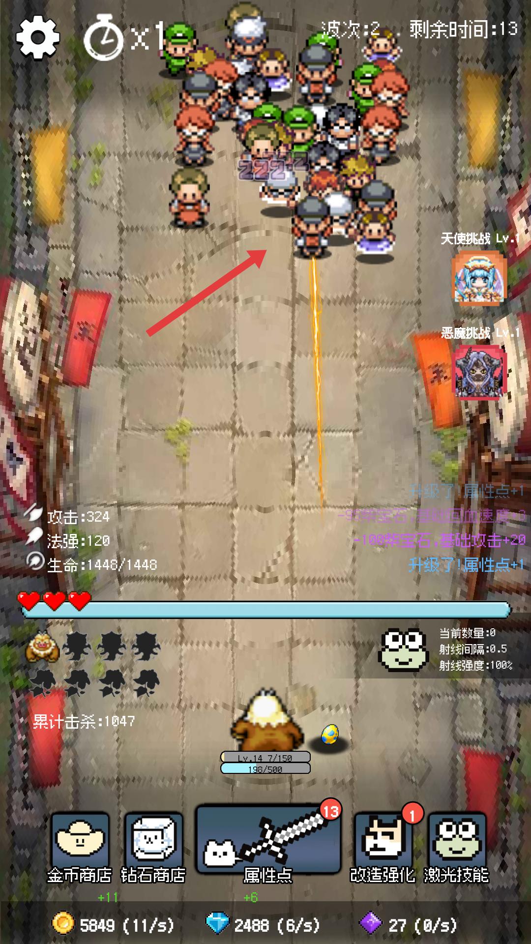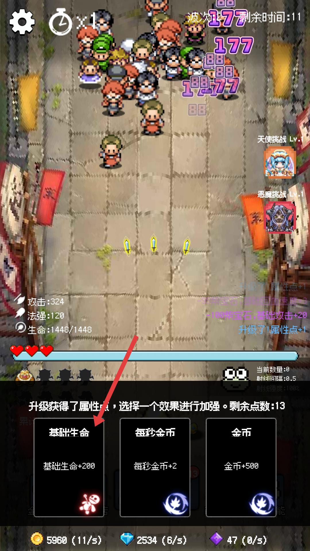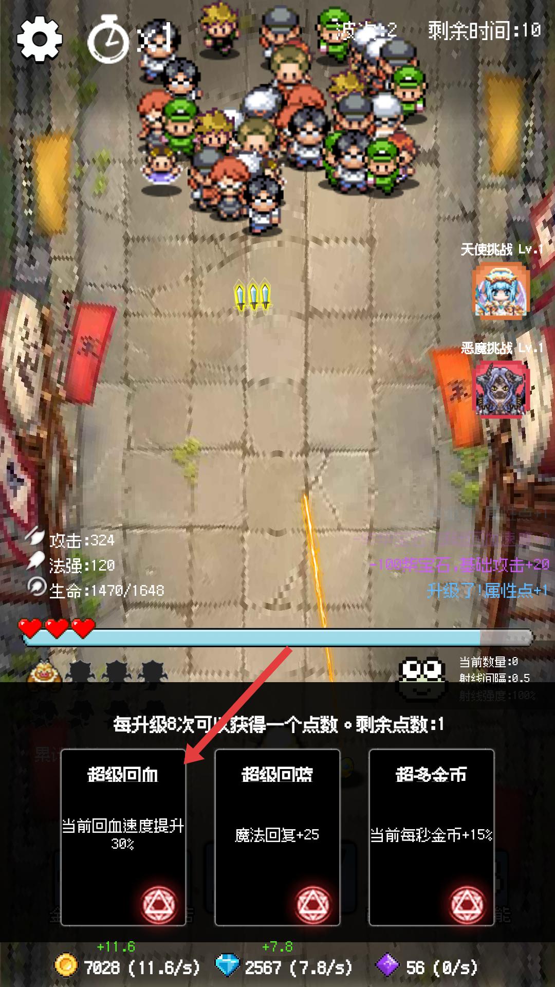 4、每升級8次能獲得一個點數,超級回血提升回血速度,超級回藍增加魔法回復,超多金幣提升每秒金幣獲取,按需挑選。