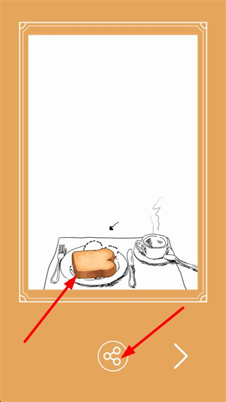 2、面包擺盤完成后界面顯示裝飾邊框,下方有分享和前進按鈕,點擊前進按鈕可進入下一個擺盤任務,繼續參與游戲流程。