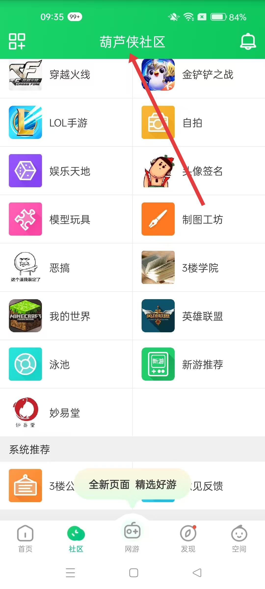 1、進入葫蘆俠社區,可看到穿越火線、金鏟鏟之戰等眾多游戲板塊,還有自拍、頭像簽名等特色板塊,可根據喜好選擇。
