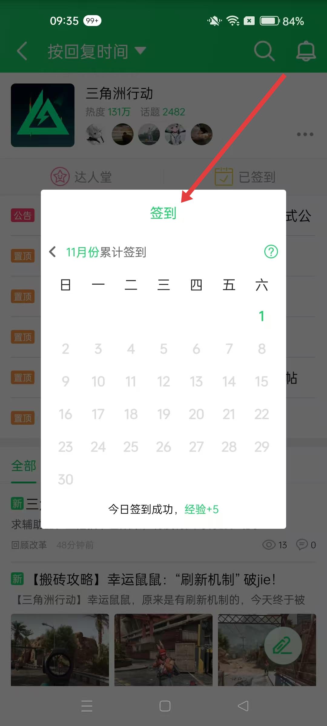 4、板塊頁面點擊簽到,可進入簽到日歷,完成每日簽到獲取經驗,還可查看每月累計簽到情況。