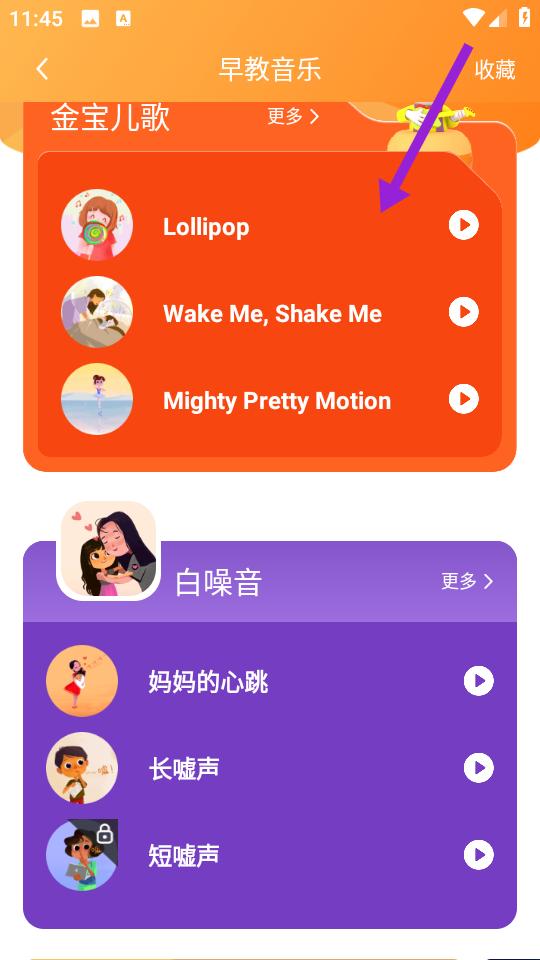 3、早教音樂頁面分金寶兒歌與白噪音,金寶兒歌有WakeMe,ShakeMe等,白噪音含媽媽心跳聲等,豐富早教音頻選擇。