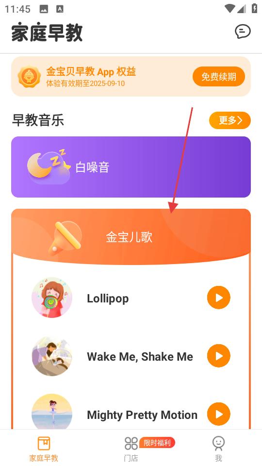 1、家庭早教頁面有金寶貝早教App權益,含早教音樂板塊,可播放Lollipop等金寶兒歌,助力寶寶早教。