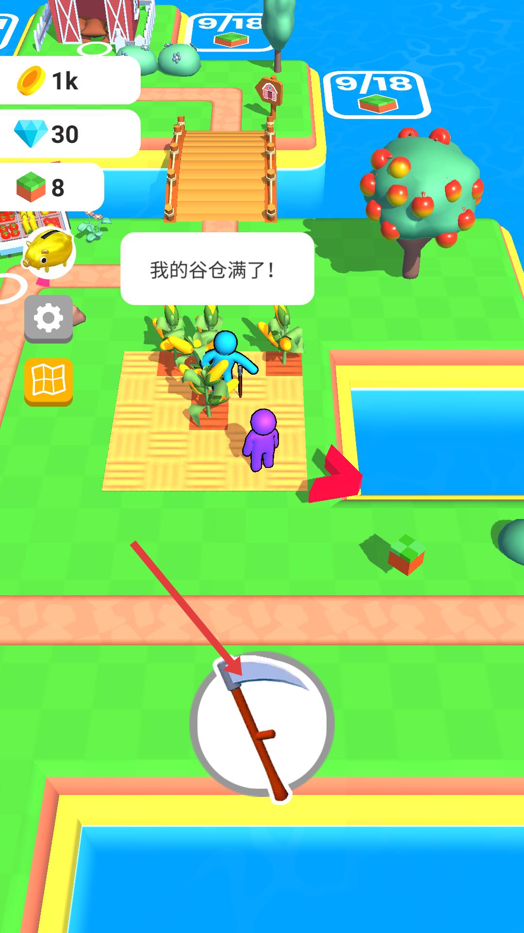 2、當谷倉滿時,使用鐮刀收割成熟作物,收割后騰出谷倉空間,還能將作物拿去交易,獲取金幣或其他資源。