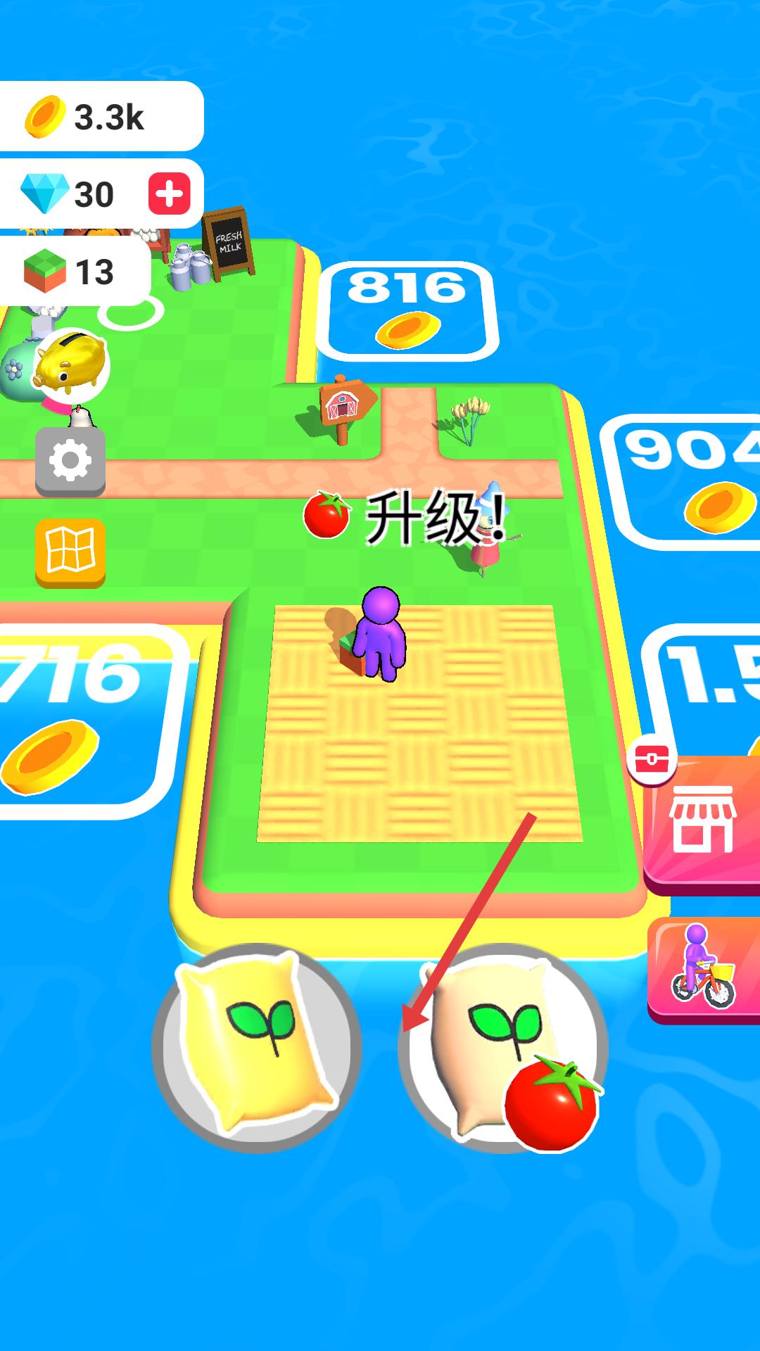 3、番茄作物升級后,點擊帶有番茄圖案的種子袋,可在田地播種升級后的番茄種子,能收獲更優質的番茄,提升收益。