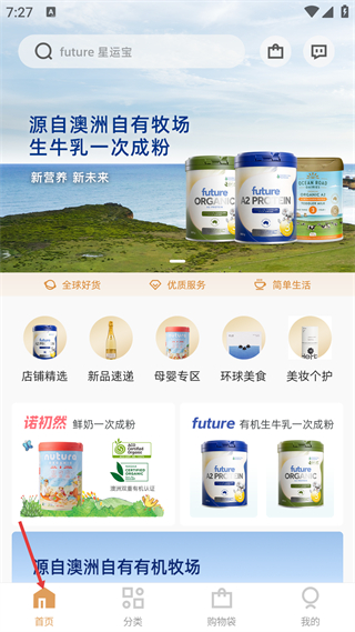 1、首頁頂部呈現源自澳洲牧場的奶粉廣告,下方分類涵蓋店鋪精選、新品速遞等板塊,陳列諾初然、future等品牌商品。