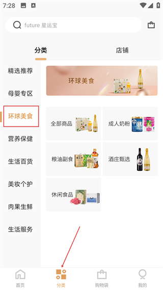 2、點擊分類進入對應頁面,選擇環球美食分類,能看到其下的子分類選項,可查看該分類下的相關商品內容。