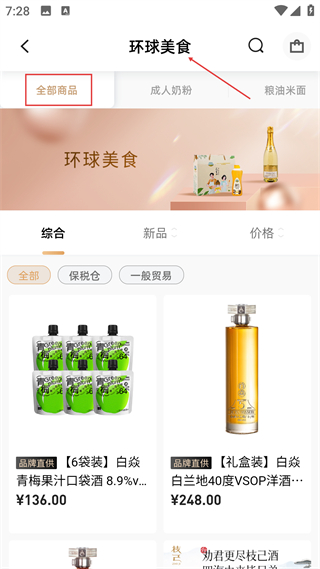 3、進入環球美食全部商品頁,展示了青梅果汁酒、白蘭地等美食商品及對應價格,可瀏覽這些商品的詳細信息。