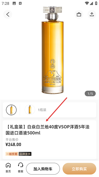 4、點擊商品進入詳情頁,能看到該白蘭地禮盒裝的信息與價格,可通過底部的加入購物車或立即購買按鈕完成選購。