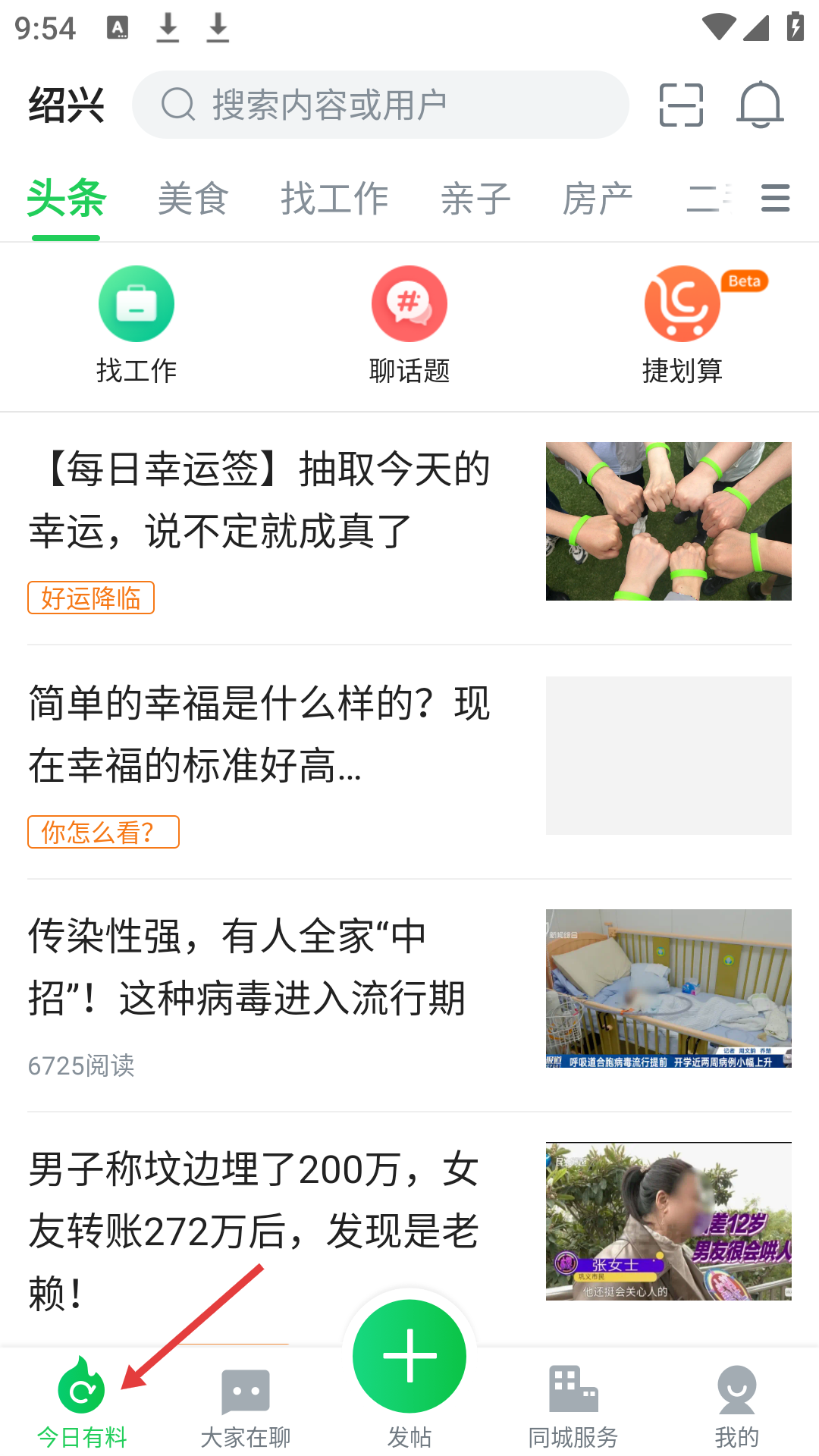 1、點今日有料頁面,有搜索欄,分頭條、美食等板塊,提供找工作、聊話題等功能,展示每日幸運簽等內容。