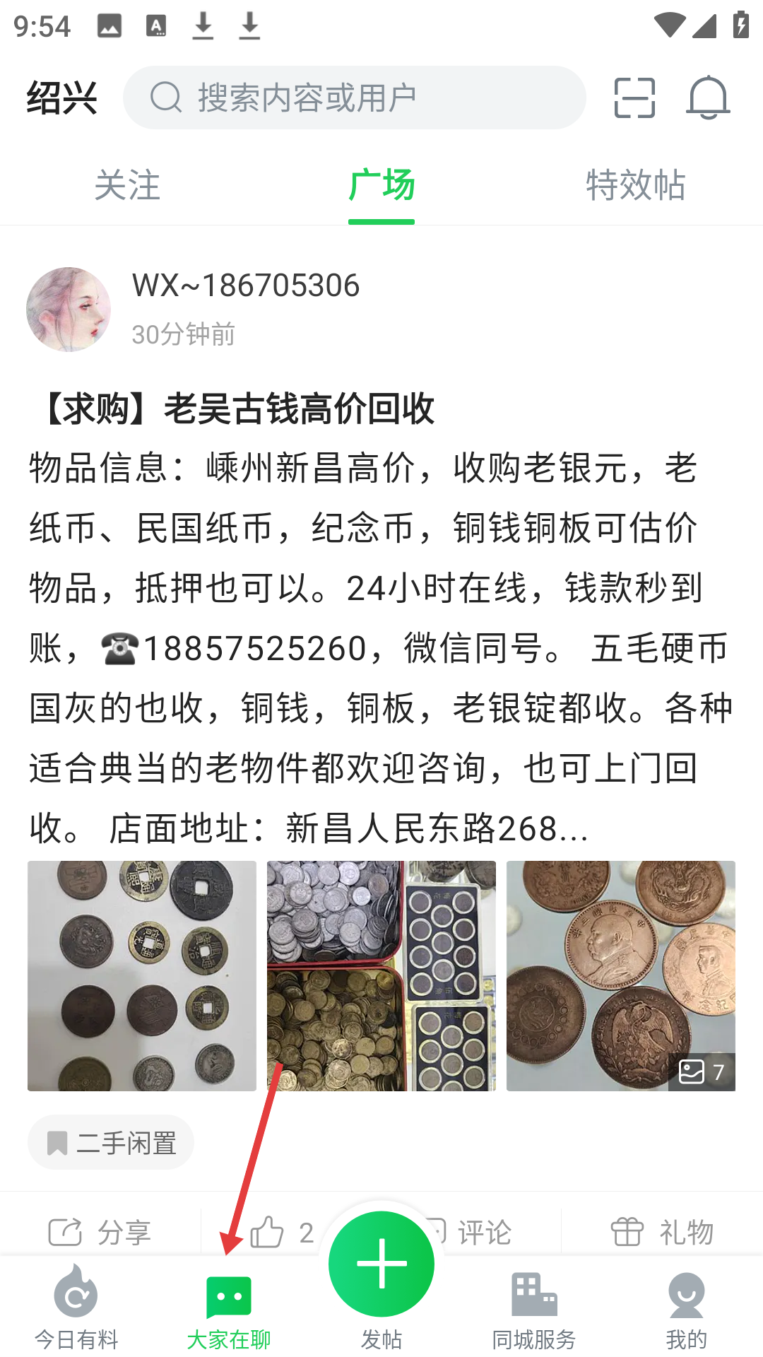 2、點大家在聊頁面處于紹興廣場分區,有用戶發布求購老吳古錢的帖子,含物品信息、聯系方式及相關古錢圖片。