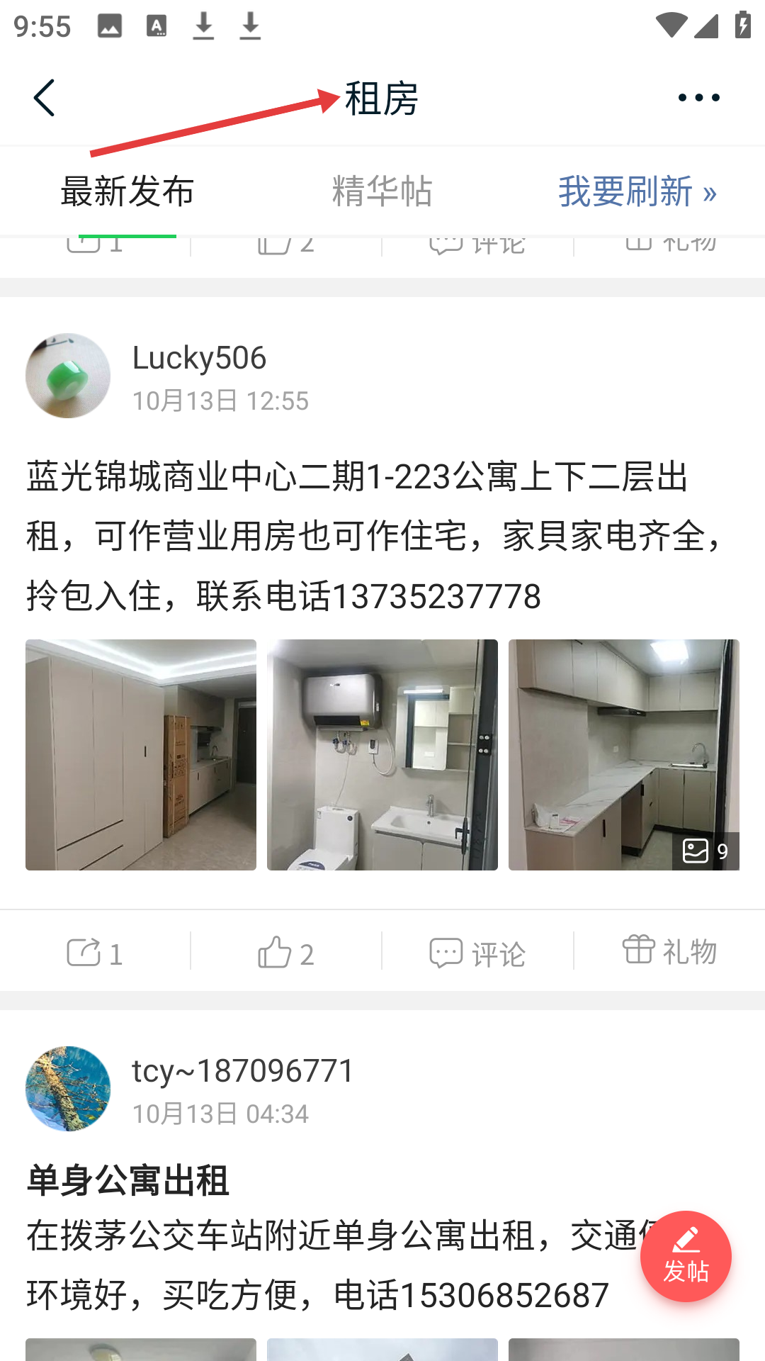 3、點租房板塊展示最新發布的租房信息,如藍光錦城商業中心二期公寓出租,家具家電齊全,還有單身公寓出租等內容。