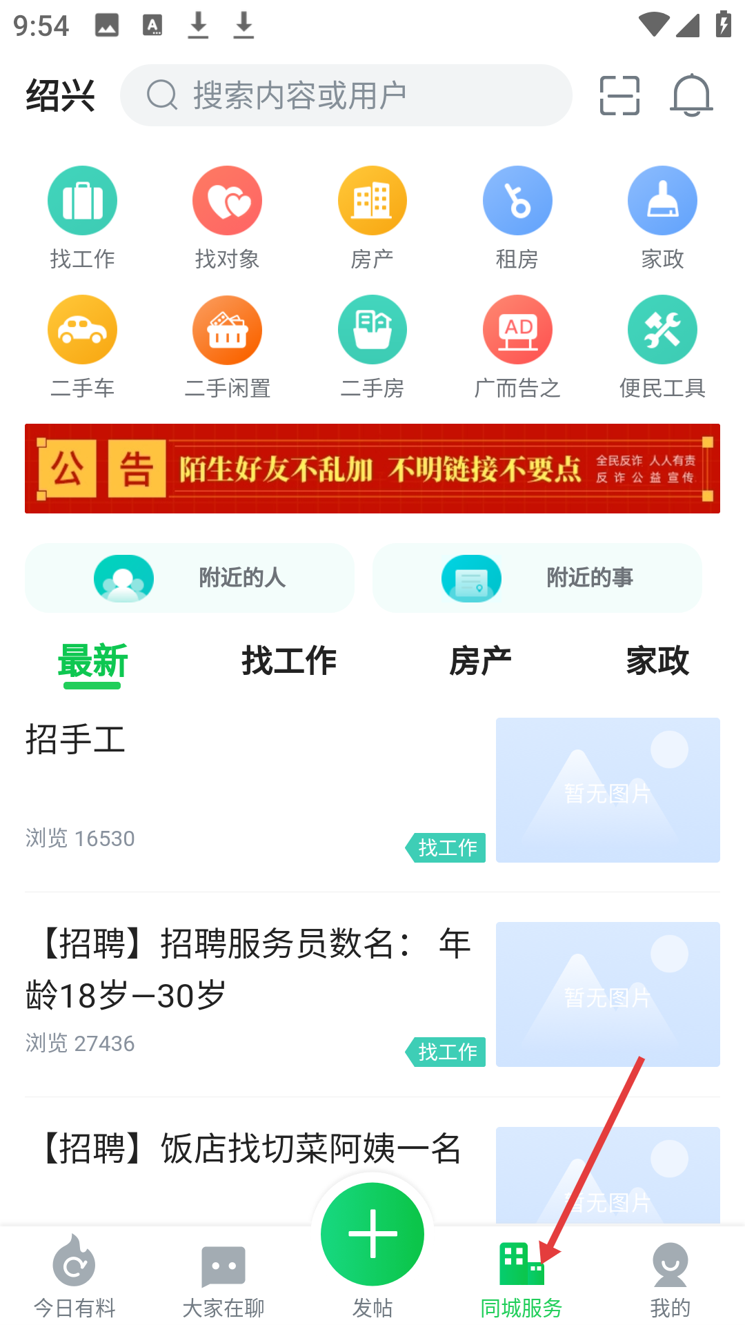 4、同城服務頁面,有找工作、找對象等多種功能入口,發布反詐公告,展示招手工、招聘服務員等本地最新信息。