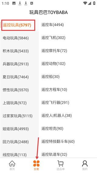 2、分類板塊,細分遙控玩具、電動玩具等品類,遙控玩具下分遙控車、遙控飛機等,方便精準查找玩具。