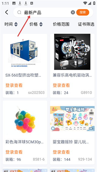 3、最新產品板塊,展示擠出吹塑成型機、兼容樂高電機等產品,標注裝箱數,需登錄查看詳情,助力了解新品。