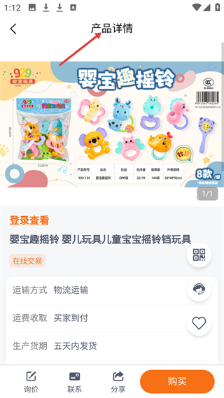 4、嬰寶趣搖鈴產品詳情頁,展示產品外觀、型號等信息,提供在線交易、購買選項,需登錄查看價格,方便玩具采購。