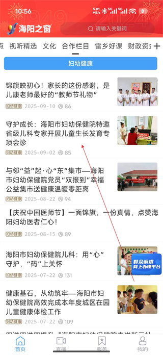 2、登錄后進入首頁切換至婦幼健康板塊,瀏覽相關資訊列表,選擇兒童生長發育專項會診的資訊,點擊進入詳情頁面。