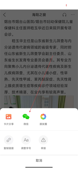 4、在資訊詳情頁面點擊分享按鈕,選擇微信等分享渠道,將該會診資訊內容分享至對應平臺,完成分享。