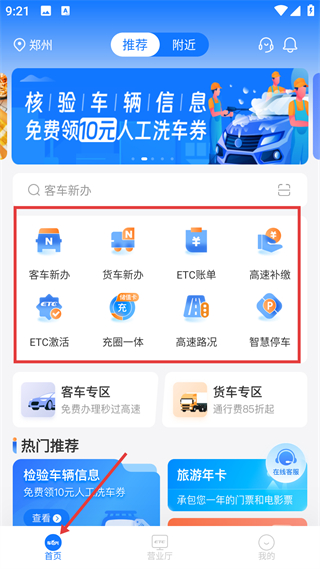 1、進入首頁,可見客車新辦、貨車新辦等功能入口,覆蓋ETC相關服務,核驗車輛信息可領洗車券,是使用服務的起始操作。