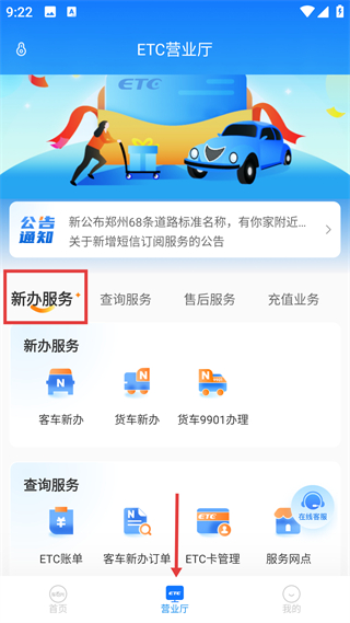 2、點擊底部營業廳,進入ETC營業廳頁面,選擇新辦服務,可找到客車、貨車ETC新辦入口,是辦理ETC的核心頁面。