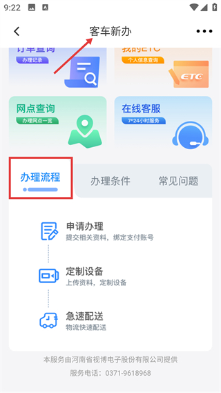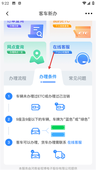 4、在客車新辦頁面切換至辦理條件,需滿足車輛未辦ETC、9座及以下藍綠牌等要求,確認條件符合后再辦理可避免無效操作。