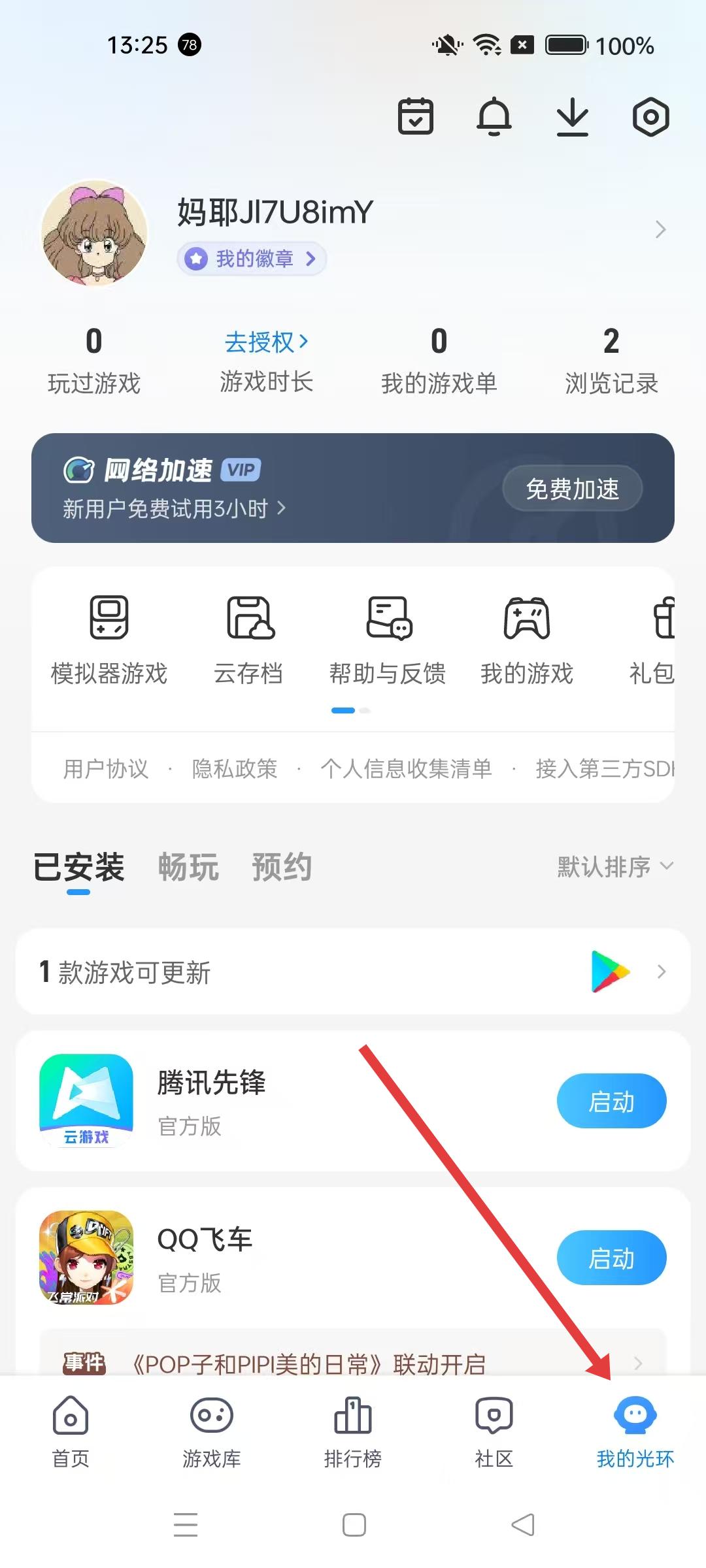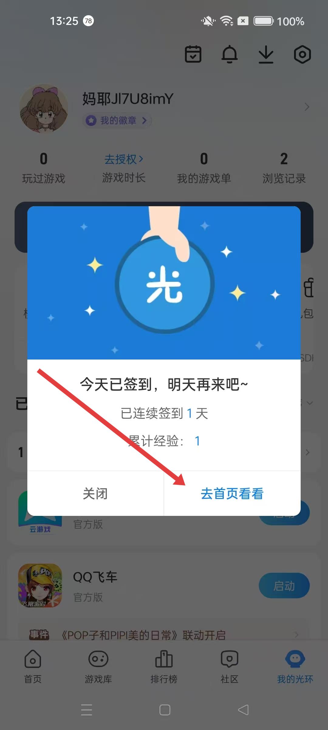2、進入我的光環界面,可看到個人信息、玩過游戲等數據,完成簽到后,可查看簽到狀態,如今天已簽到、連續簽到天數等信息。