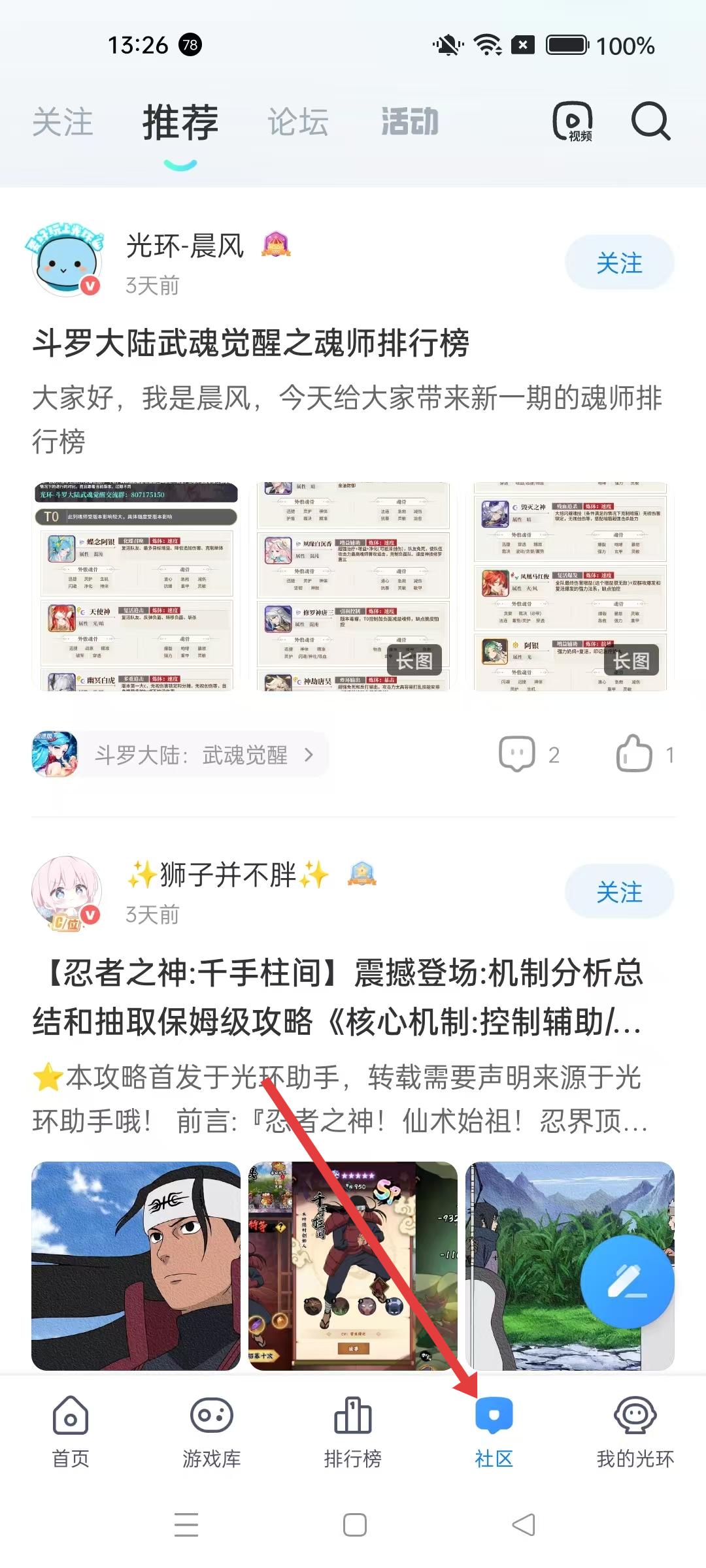 4、社區界面,可看到關注、推薦等板塊,有斗羅大陸武魂覺醒之魂師排行榜、忍者之神千手柱間攻略等帖子,可閱讀感興趣的游戲內容。