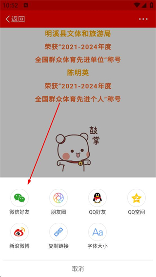 4、選擇想要分享的渠道,比如微信好友或朋友圈等。確認選擇的分享給微信好友,也可選擇復制鏈接后手動分享。