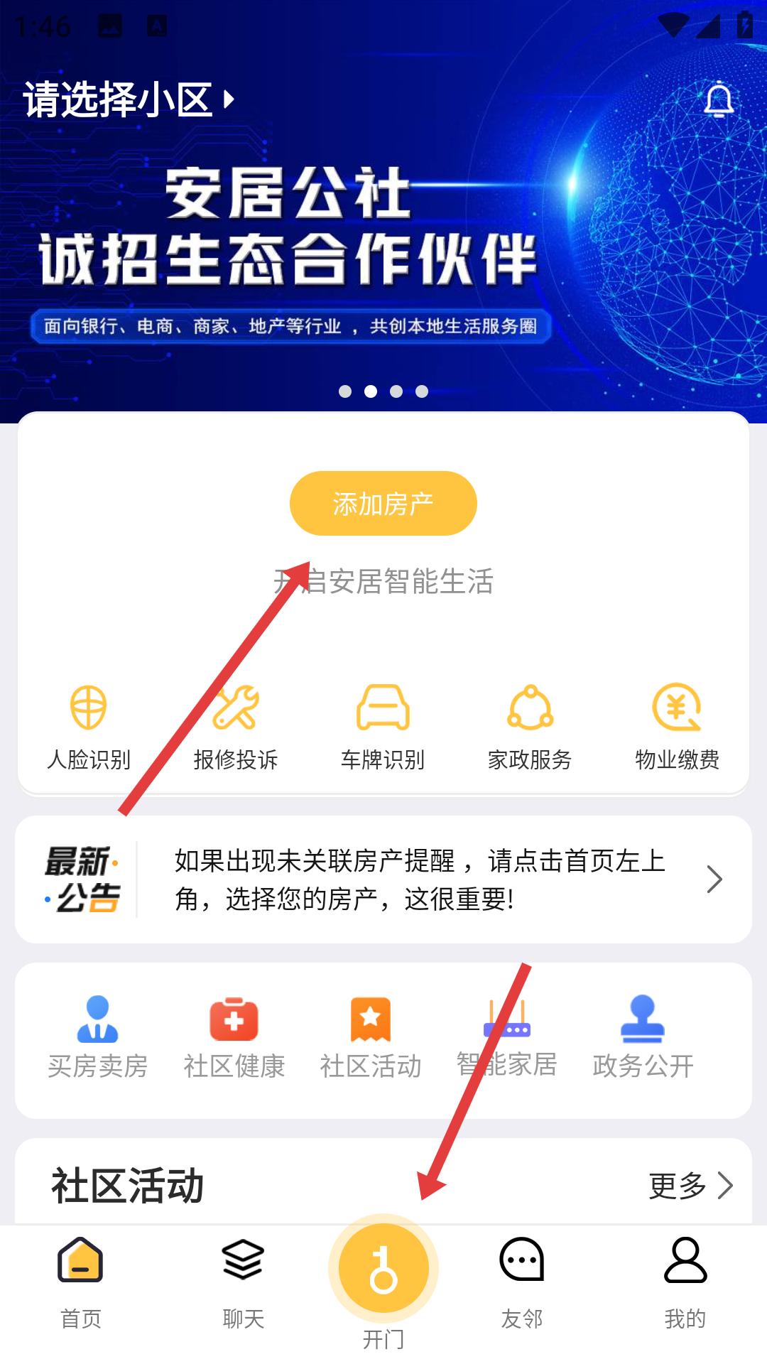 2、在首頁點擊添加房產,按指引關聯房產信息,開啟人臉識別報修投訴等智能生活服務。