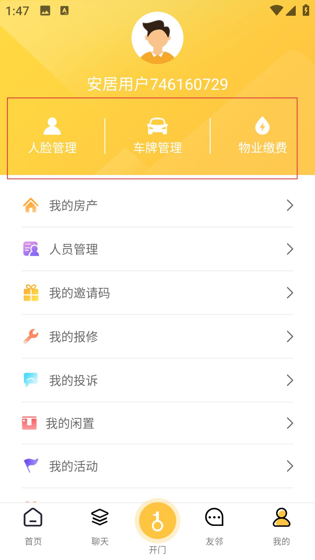 3、切換到我的頁面,使用人臉管理車牌管理等功能,還可進行物業繳費房產管理等操作。