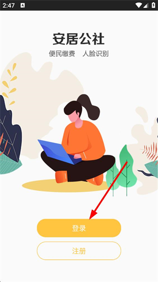 1、進入安居公社應用,可見便民繳費、人臉識別等功能提示,點擊登錄按鈕可進入登錄流程,也可選擇注冊成為新用戶。