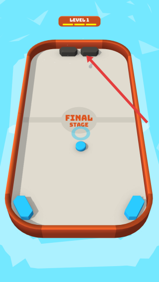 3、到最終階段,場地上方有黑色障礙物,要操控藍色圓盤,想辦法突破這些障礙物,完成第一關的挑戰。