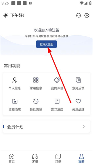 2、進入我的頁面后,會看到歡迎加入錦江薈的提示及登錄注冊按鈕,常用功能板塊包含個人信息等多項操作入口,同時可查看會員計劃相關內容。