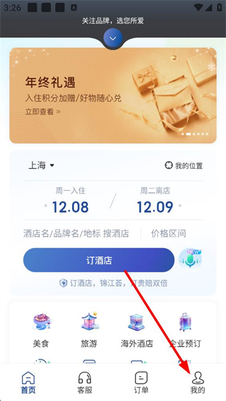 1、進入錦江薈首頁,可看到年終禮遇活動入口,先選擇所在城市及入住離店日期,點擊訂酒店按鈕可發起預訂,還能使用美食旅游等功能,點擊底部我的進入個人頁面。