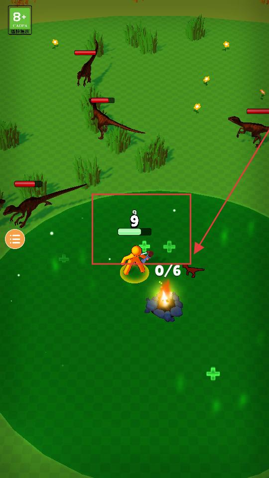 2、移動角色靠近篝火能獲得生命值等增益效果,同時留意周圍恐龍的動向,提前規劃好移動路線,避免過早與強大恐龍遭遇。