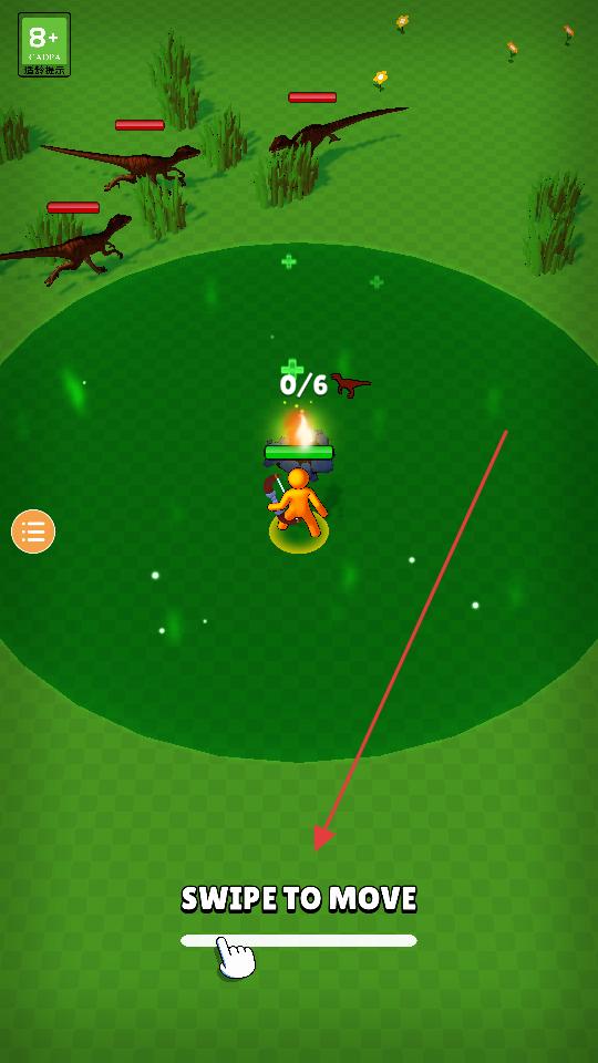 1、進入游戲通過滑動屏幕來控制角色移動,在綠色的場景中帶著武器的角色可朝著恐龍或篝火等目標方向滑動,開啟生存挑戰之旅。