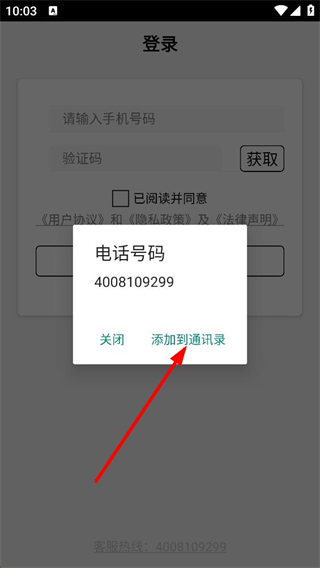 4、登錄界面點擊客服熱線后,會彈出對應的電話號碼窗口,可選擇關閉該窗口,也能點擊添加到通訊錄將號碼保存至手機通訊錄。