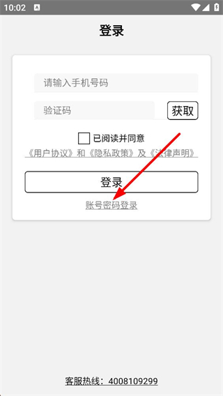 1、進入登錄界面,可選擇輸入手機號碼獲取驗證碼的方式登錄,需先勾選已閱讀并同意相關協議,也能點擊賬號密碼登錄切換登錄方式。
