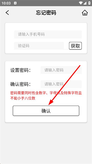 3、進入忘記密碼界面,先填寫手機號碼并獲取輸入驗證碼,再設置包含數字字母特殊字符且不少于八位的密碼,確認密碼后點擊確認完成重置。
