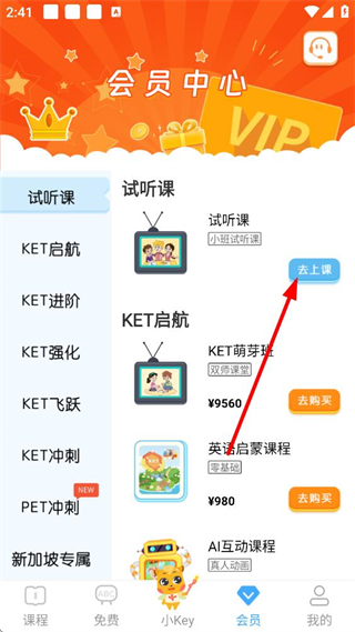 3、點擊底部會員按鈕進入會員中心頁面,可見試聽課、KET啟航等課程分類,點擊試聽課對應的去上課按鈕,進入設備設置頁面。