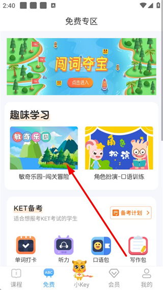 2、進入免費專區頁面,包含闖詞奪寶互動板塊,及敏奇樂園闖關冒險、角色扮演口語訓練等趣味學習入口。