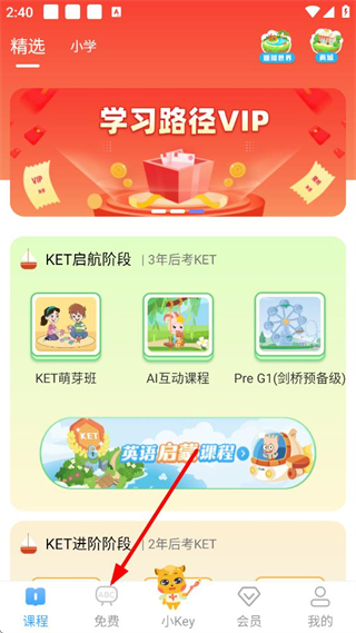 2、在課程頁,選不同階段課程,點對應班型,進入學習,用平臺功能,提升英語水平,備考KET。