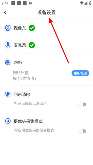 4、進入設備設置頁面,可管理攝像頭、麥克風等設備權限,檢測網絡質量,還能設置回聲消除、攝像頭采集模式等上課相關功能。