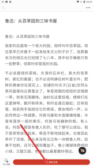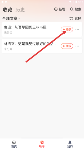 2、聽單頁面,可看到收藏或歷史中的文章,如魯迅從百草園到三味書屋,點擊播放,開始收聽文章朗讀。