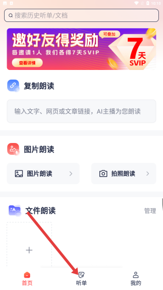 1、進入朗讀類APP首頁,能看到復制朗讀、圖片朗讀、文件朗讀等功能,點擊底部聽單,進入聽單頁面。