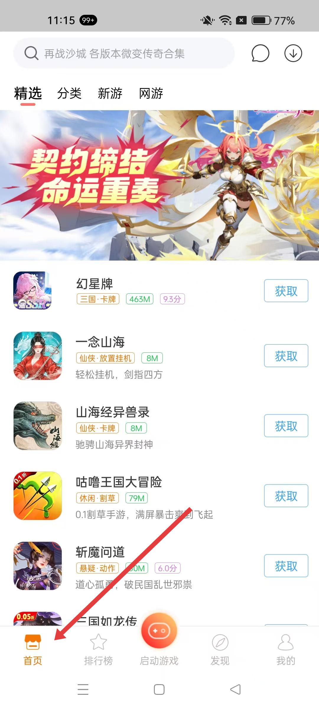 1、進入游戲平臺首頁,可瀏覽幻星牌、一念山海等各類游戲推薦,點擊獲取可下載游戲,開啟游戲體驗。