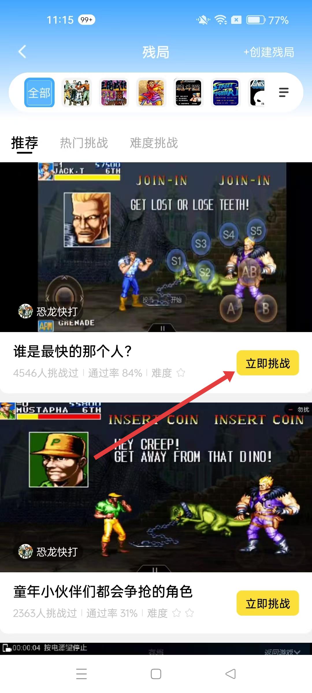 3、殘局挑戰界面,可看到恐龍快打等游戲的殘局挑戰推薦,點擊立即挑戰可參與相應的游戲挑戰,檢驗游戲技巧。